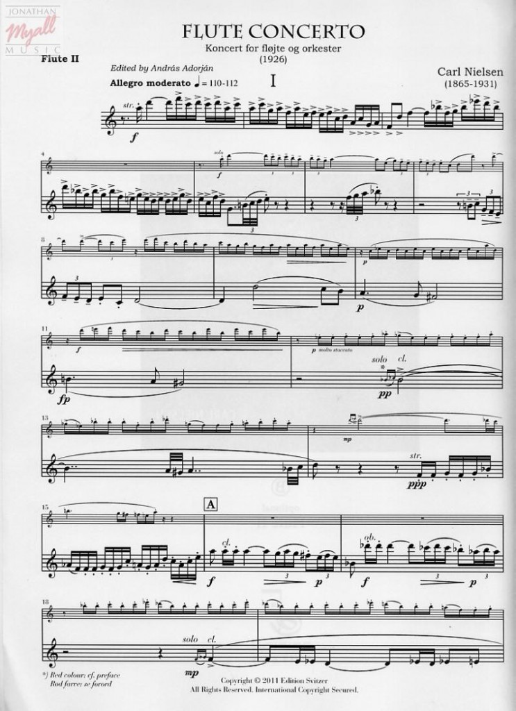 As this is a Danish company, the music of Nielsen is well represented in the Svitzer catalogue. The famous Flute Concerto is edited by András Adorján, and is probably the best version on the market at the moment. Its unique selling point is that it includes two copies of the solo flute part: the first version has all the important orchestral writing cued on a separate stave, whilst the second version has the orchestral writing arranged for a second flute. This has the obvious advantage of being able to get to know the score completely before standing in front of the orchestra. Care has been taken to highlight the important orchestral lines in both harmony parts and in the piano reduction, which has been made a little less exacting. Altogether this is a very impressive edition and well worth investigating.